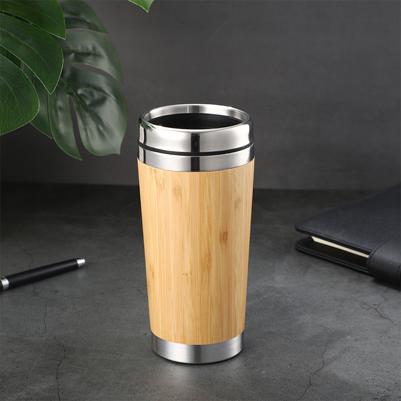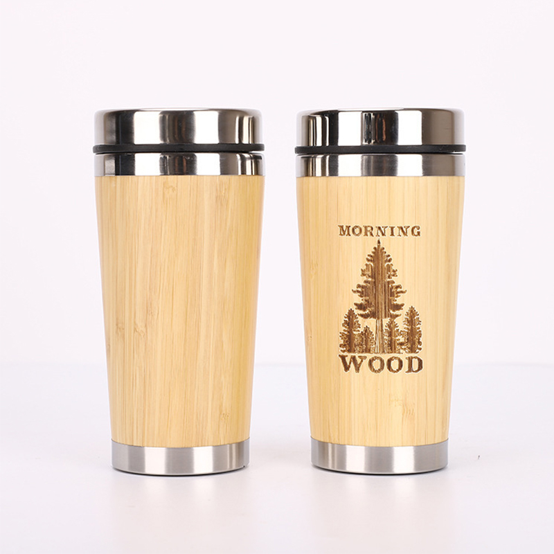 Custom Logo Vacuum Sealed 304 Stainless Steel Flask 450ML Bamboo Shell Coffee Mug Eco-friendly Wood Car Tumbler Cups