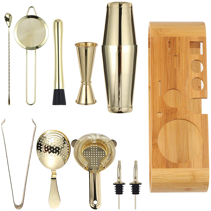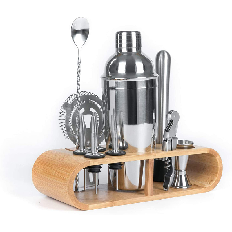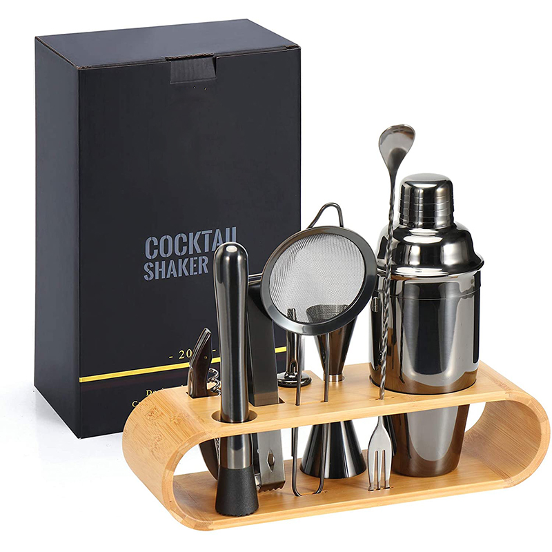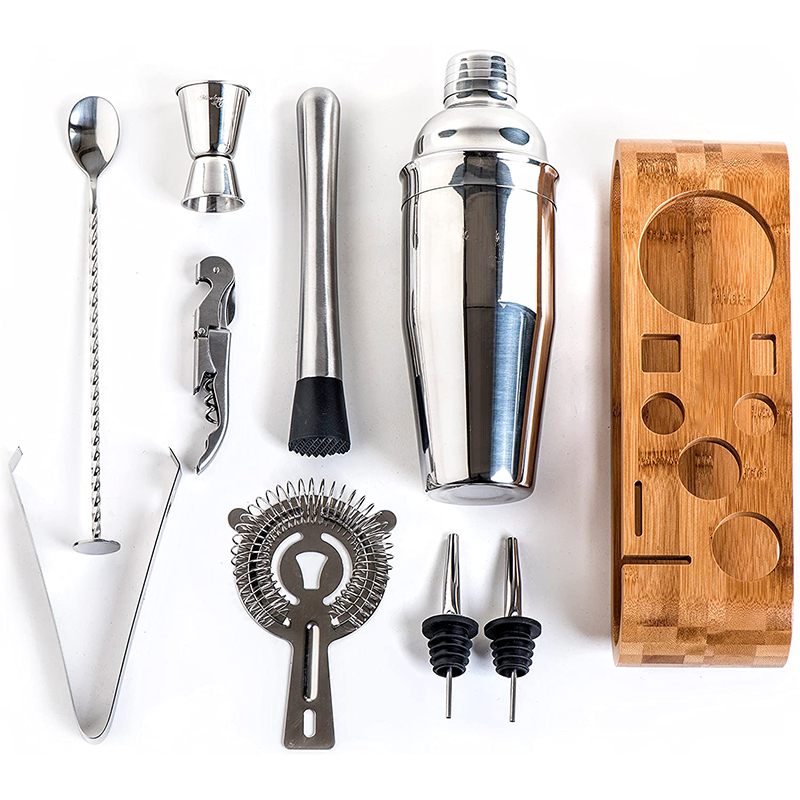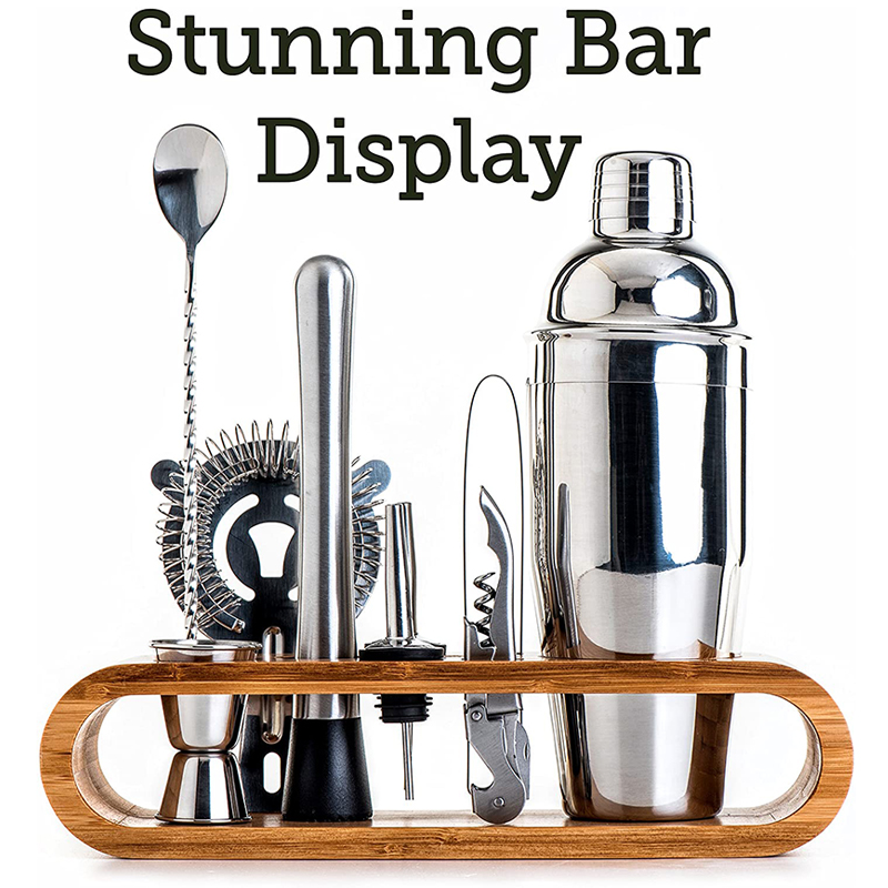 Custom Bartender Kit Bar Set Vinobravo Jigger Cocktail Shaker 10pcs Set 750ml Stainless Steel With Bamboo Stand