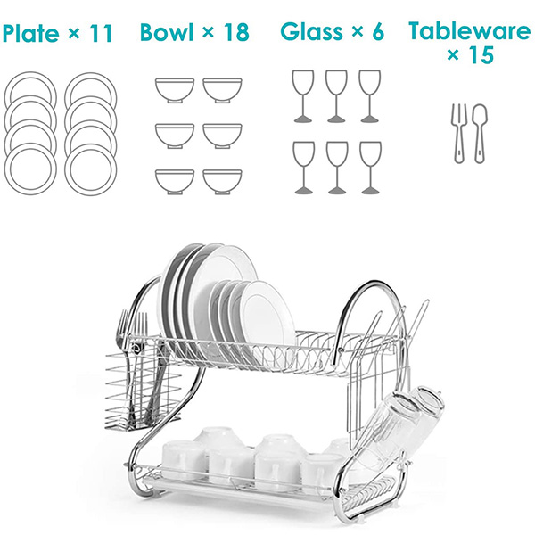 【HIGH CAPACITY】Measures 26*40*40cm; Top tier places up to dishes of various sizes and depths, down tier places up to bowls .Racks on both sides of the dish rack are suitable for storing glasses, kitchen utensil, and tableware; Compact sized and beautifully styled make it a perfect complement to your kitchen countertops.