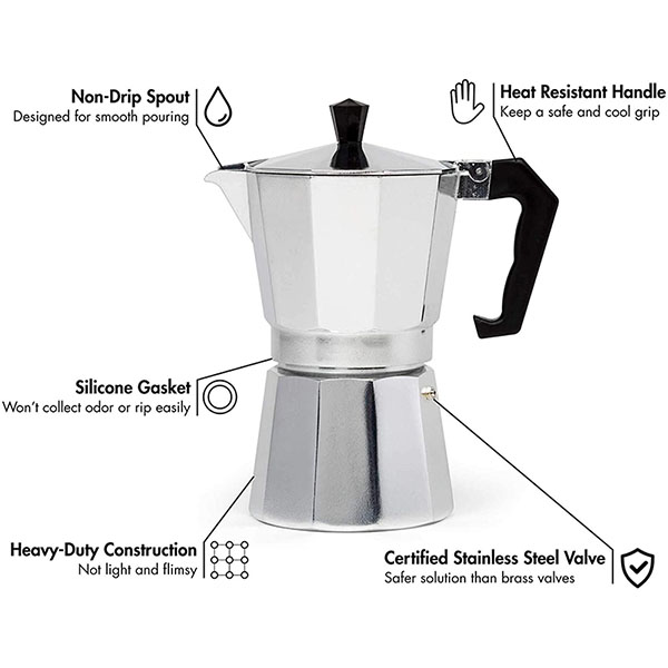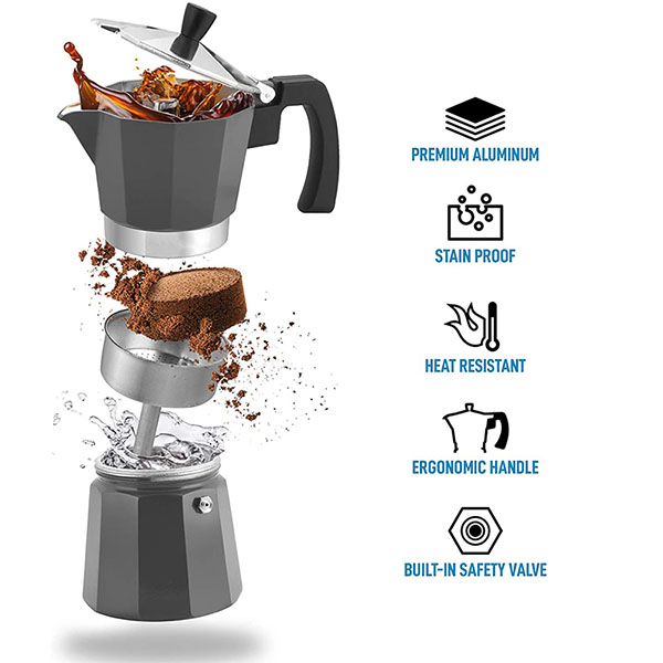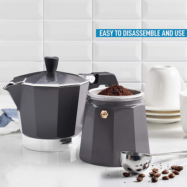 ♚EXCEPTIONAL DESIGN: The RIPPLESOURCE 6-Cup Aluminum Espresso Maker features a modern, stylish design with a high-quality aluminum body. The handle is made from a heat resistant plastic that not only provides you with a firm and reliable grip, but also allows your hand to stay cool during use. Its efficient layout forces pressurized water through coffee grounds, and deposits a rich, full bodied espresso blend into the serving chamber