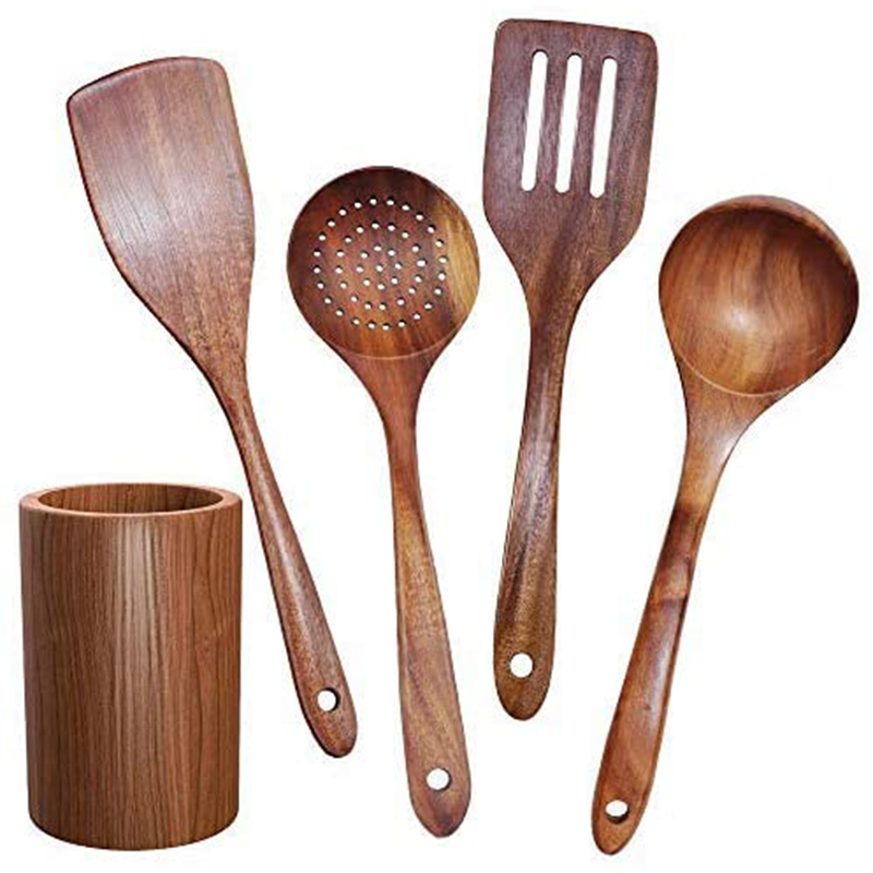 ✔LIFELONG QUALITY: Woodenhouse kitchen utensils will last a lifetime, they are made of one piece 100% Natural Teak Wood. These tools are beautiful, solid, sturdy, smooth, well designed and have a superb finish. Spoon set will definitely not crack, melt or smell. Utensils may vary in shade because of its natural material.