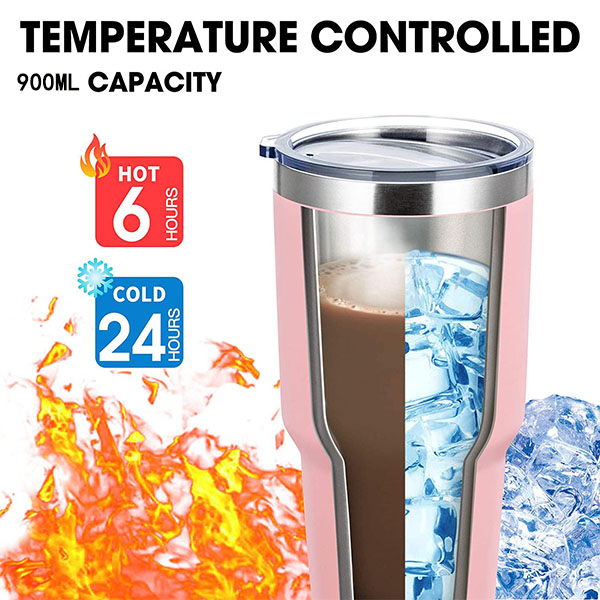 ♚ VACUUM INSULATED TUMBLER: 900ML Insulated tumbler has vacuum double wall design which ensures a good insulation. No matter which season you are in, you can enjoy your favorite hot and cold drinks for a long time. Keeping hot drinks hot for up to 6 hours and cold drinks cold for up to 24 hours.