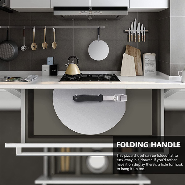 🍕【Folding Handle】Save your precious space. This pizza shovel can be folded flat to tuck away in a drawer. If you’d rather have it on display there’s a hole for hook to hang it up too.