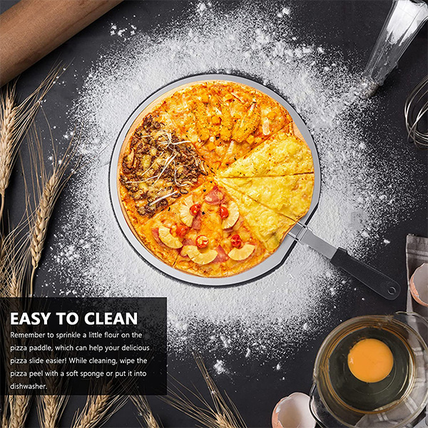 🍕【Easy to Use& Clean】 The strong handle and light weight ensure your wonderful using experience. Remember to sprinkle a little flour on the pizza paddle, which can help your delicious pizza slide easier! While cleaning, wipe the pizza peel with a soft sponge or put it into dishwasher.