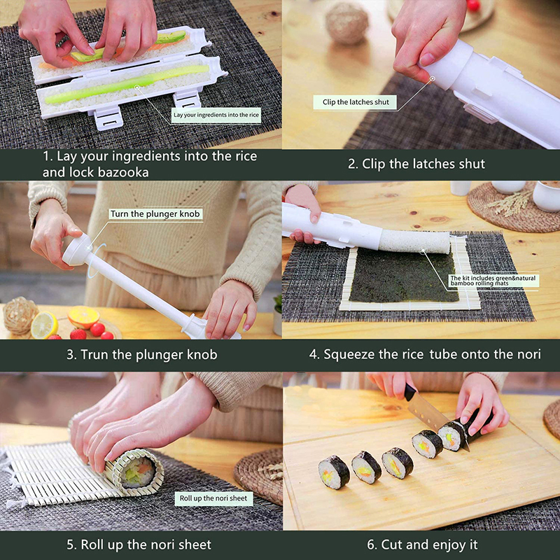 ♚4 Different Sushi Tools: Do you want to try to make basic sushi rolls, Temaki sushi, Nigiri sushi, Gunkan, etc different sushi? Get this sushi making kit you will get four different sushi tools. The Bamboo Mats can make basic sushi rolls like a pro, like California rolls. The Bazooka Roller can easily finish a rice roller, it’s kind to beginners. The Temaki Mats is the love of Temaki sushi lovers. The Rice Mold can easily make Nigiri, Gunkan sushi